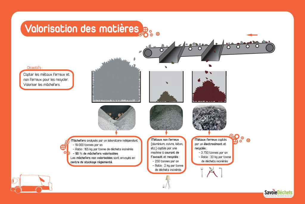 À l’issue du processus d’incinération, sont produits des mâchefers qui sont à leur tour valorisés ou stockés, en fonction des résultats des analyses, ainsi que des résidus d'épuration des fumées d'incinération des ordures ménagères (REFIOM).